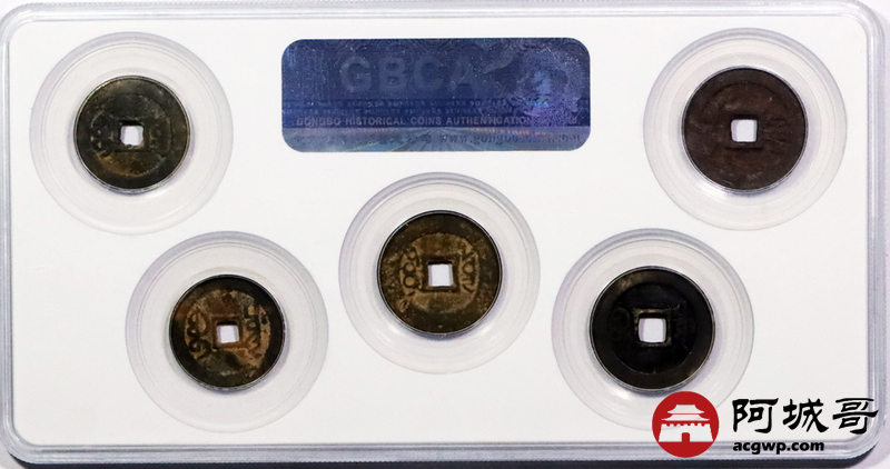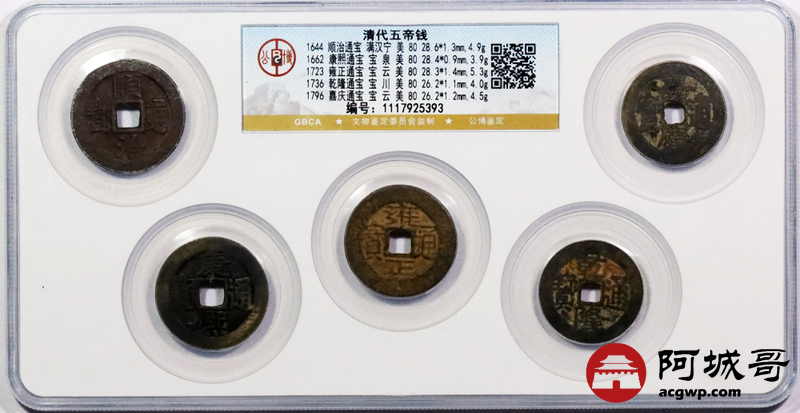 Lot:16 清五帝钱套装,顺治满汉宁,康熙宝泉,雍正宝云,乾隆宝川,嘉庆宝云 公博 美80