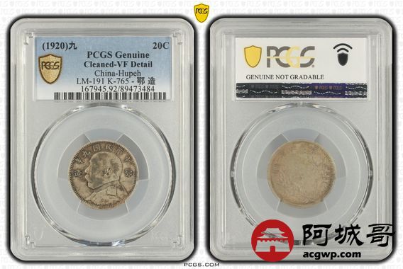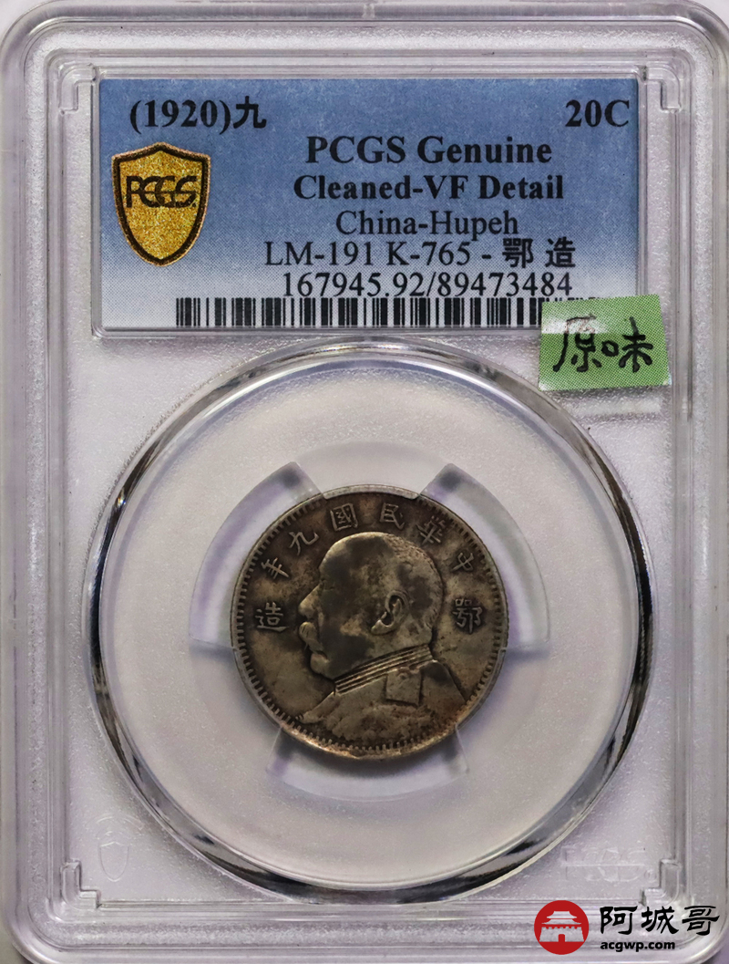 Lot:17 原味包浆 深打 鄂造九年大头贰角 PCGS VF