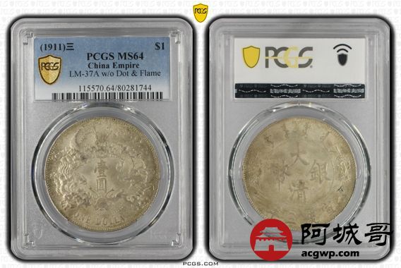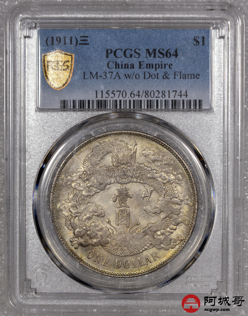 Lot:8 黄油原光 大清宣三壹圆 状态一流 PCGS MS64