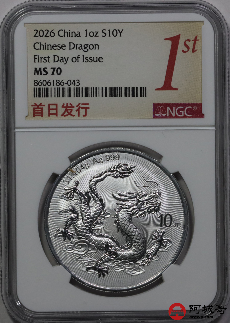 Lot:48 2026年中国龙银币 NGC MS70首日标