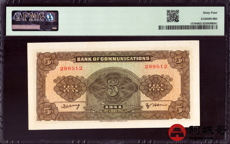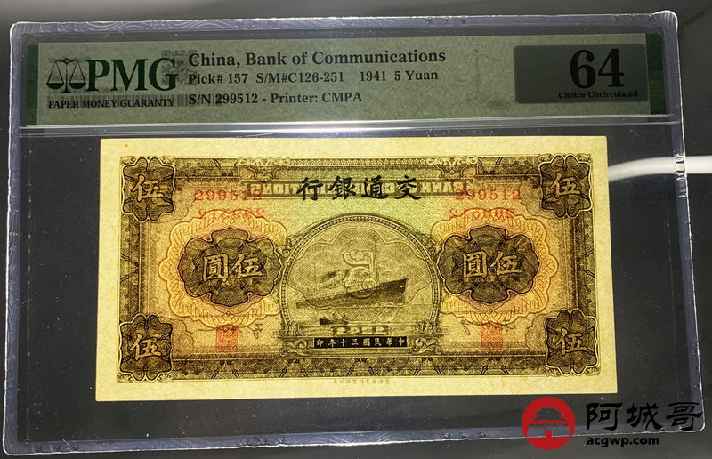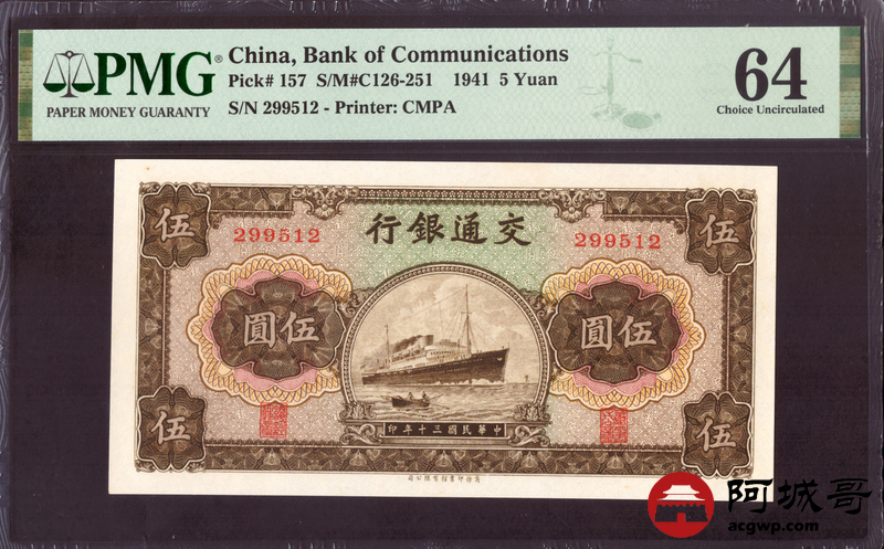 Lot:35 民国三十年 交通银行 伍圆 PMG 64 好号无47