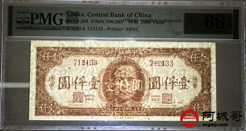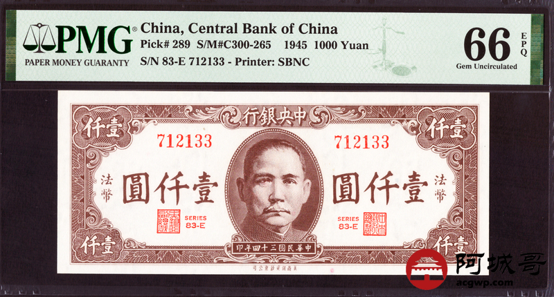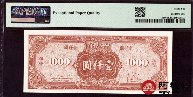 Lot:68 民国34年 中央银行 壹仟圆 PMG 66EPQ 好号无4