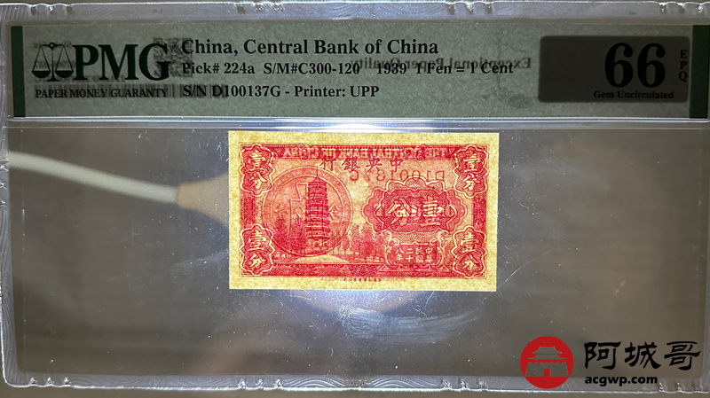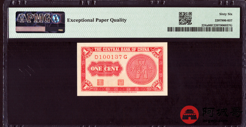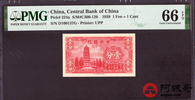 Lot:3 民国28年 中央银行 壹分 PMG 66EPQ 好号无4