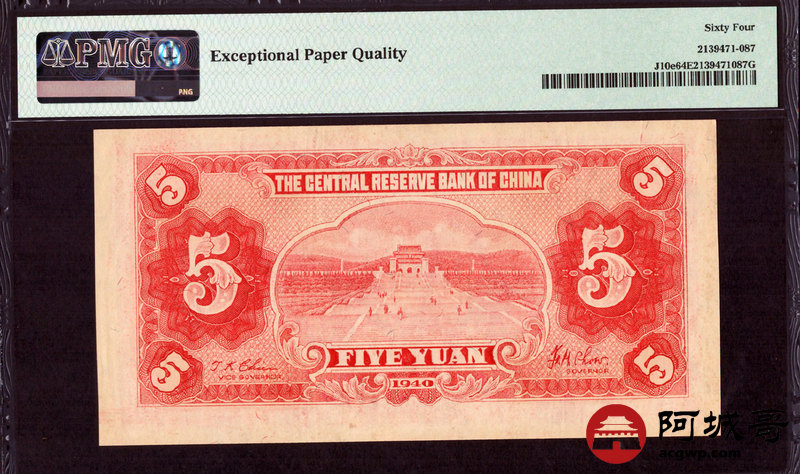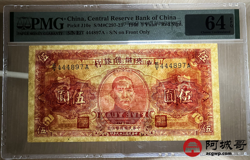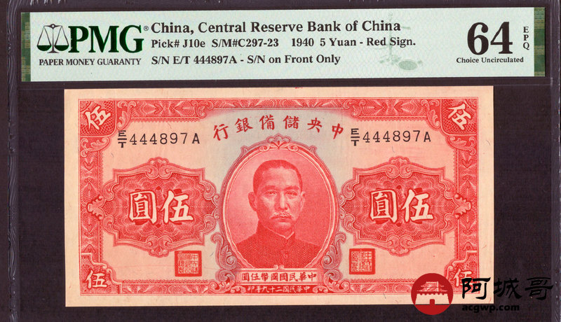 Lot:70 民国29年 中央储备银行 伍圆 PMG 64 EPQ