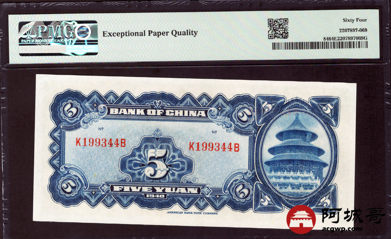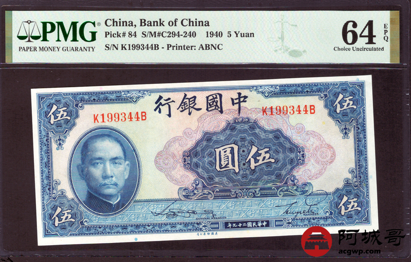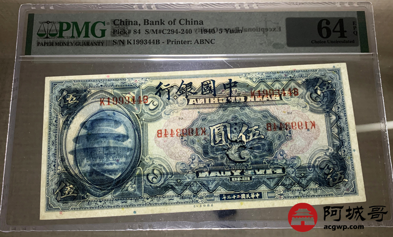 Lot:14 民国二十九年 中国银行 伍圆 PMG 64EPQ 生日号