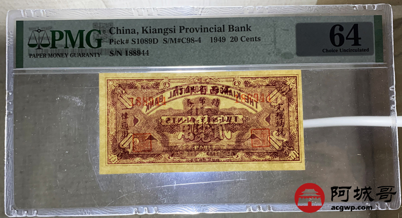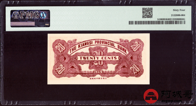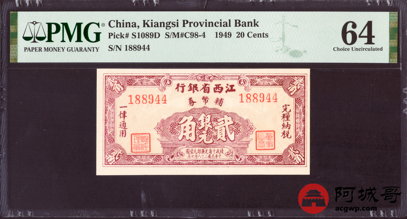 Lot:69 民国三十八年江西省银行 贰角 PMG 64