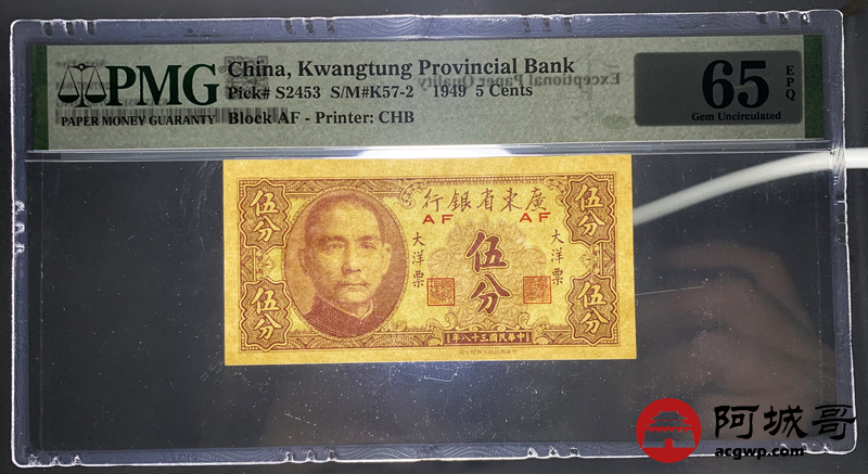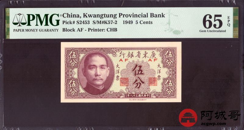 Lot:21 民国三十八年 广东省银行 伍分 PMG 65EPQ