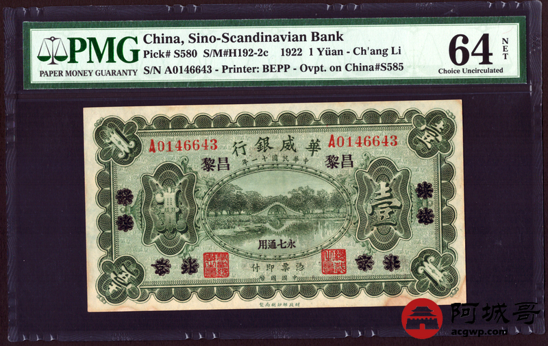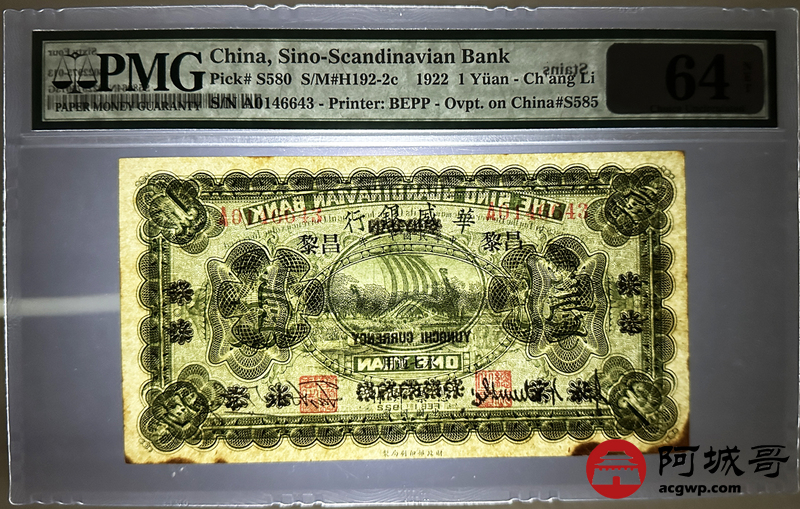 Lot:48 民国11年 华威银行 壹圆 加盖昌黎 PMG 64