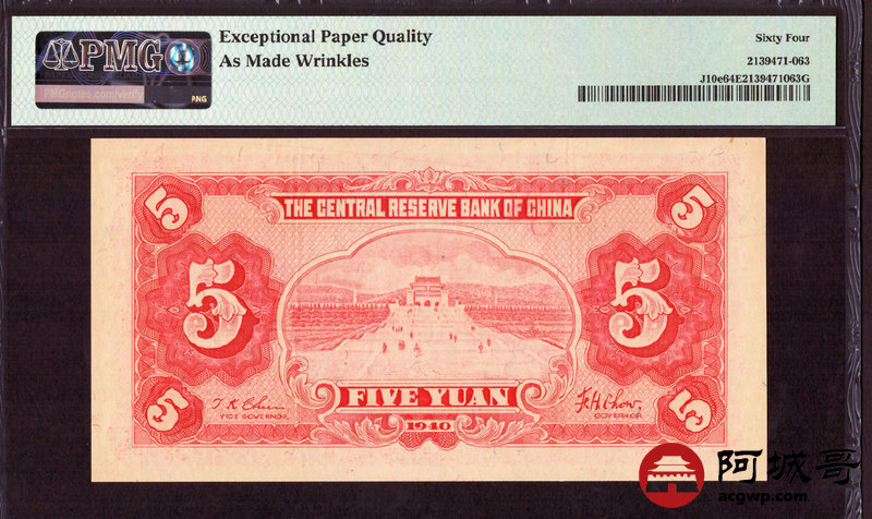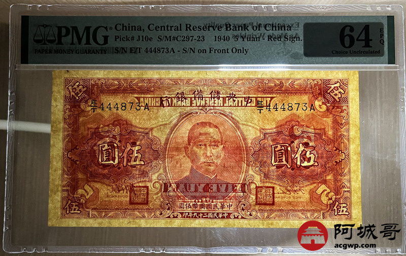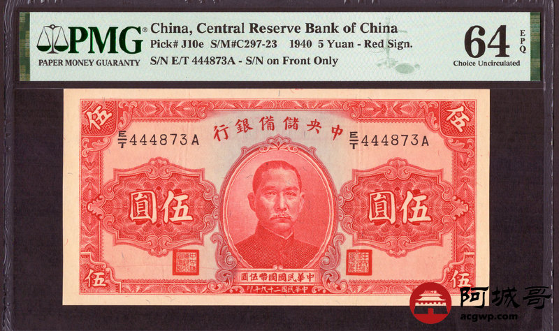 Lot:64 民国29年 中央储备银行 伍圆 PMG 64 EPQ 内有豹子号