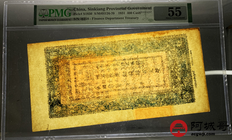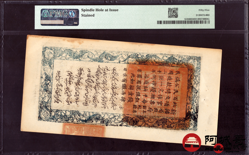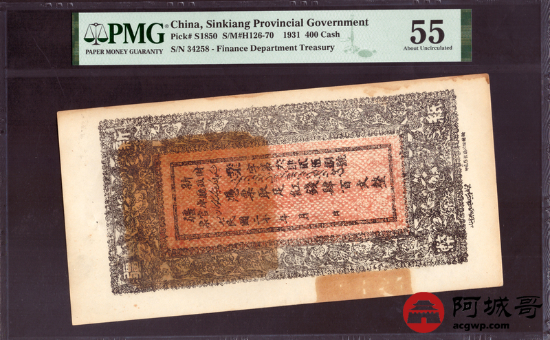 Lot:28 民国20年 新疆财政厅库官票 红钱肆佰文整 PMG 55