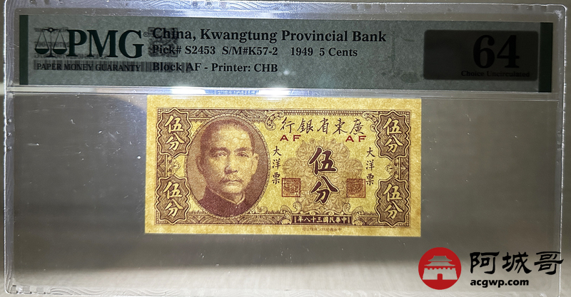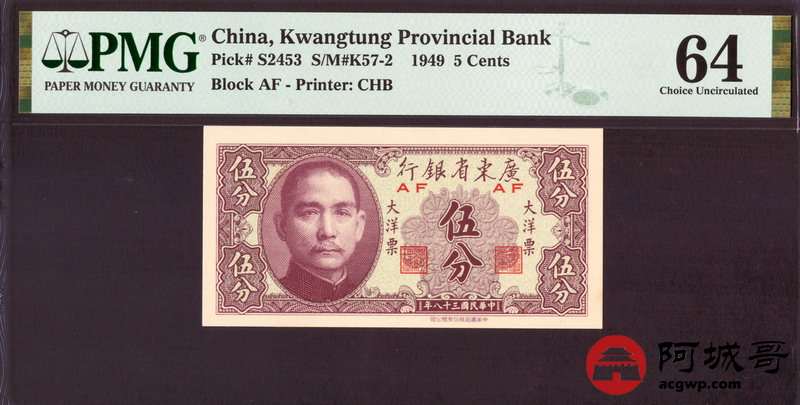 Lot:66 民国三十八年 广东省银行 伍分 PMG 64