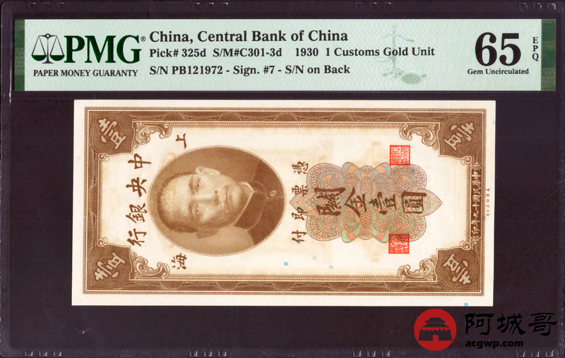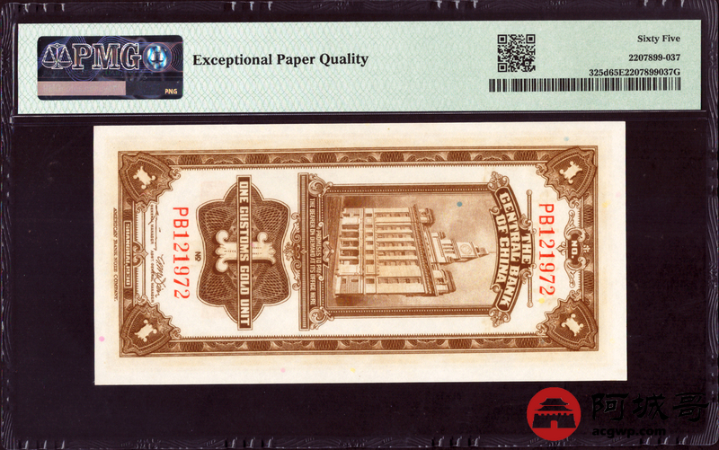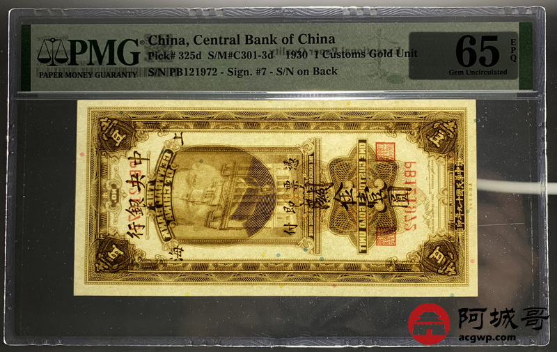 Lot:15 民国19年 中央银行 关金壹圆 PMG 65EPQ
