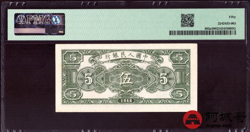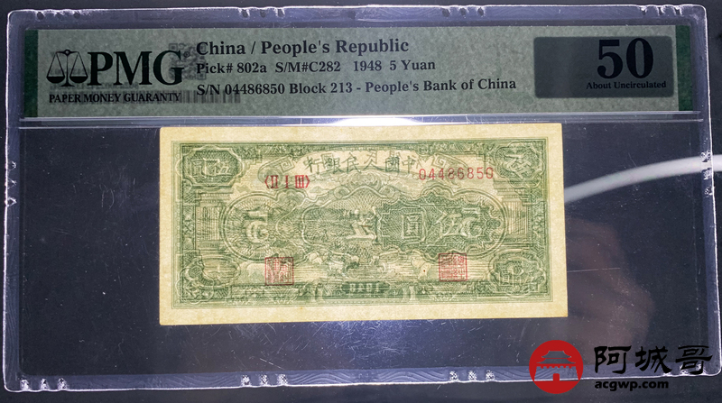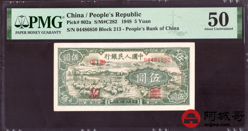 Lot:7 一版 民国三十七年 中国人民银行 伍圆小绵羊 PMG 50