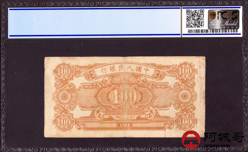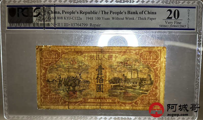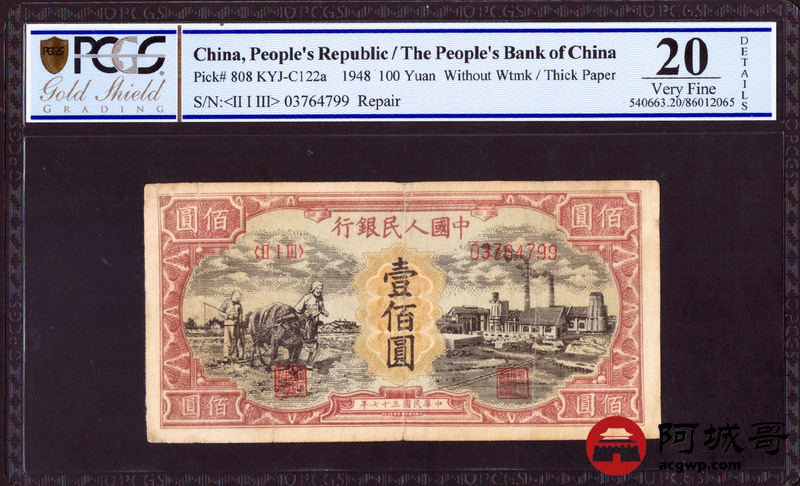 Lot:6 一版 民国37年 壹佰圆耕地工厂 PCGS 20 无水印厚纸版