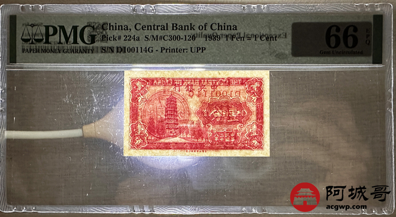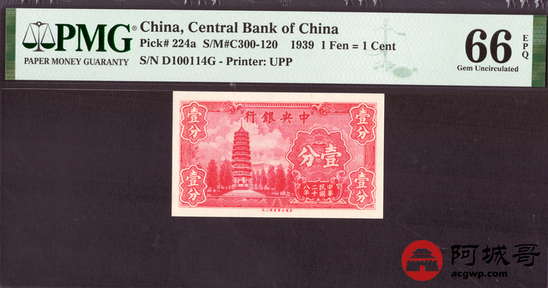 Lot:30 民国28年 中央银行 壹分 PMG 66EPQ 数三号