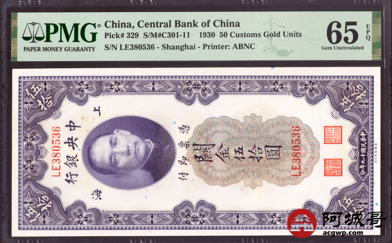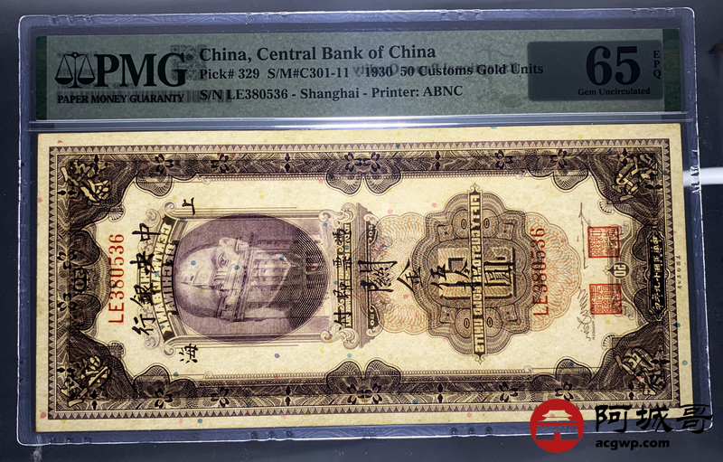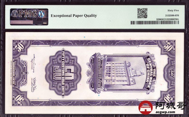 Lot:53 民国十九年 关金伍拾圆 PMG 65EPQ 好号无47