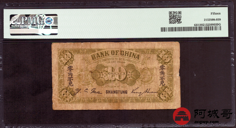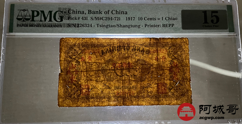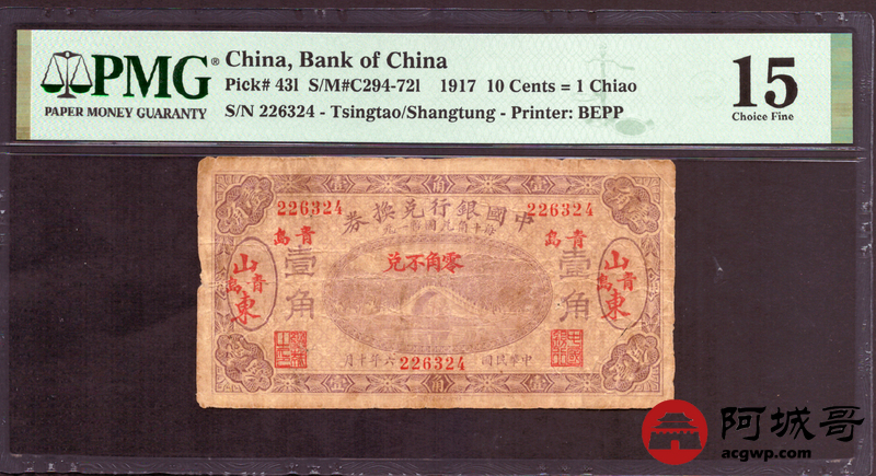 Lot:31 民国6年 中国银行兑换券 壹角 山东青岛地名 PMG 15 总评级数13张 极少见